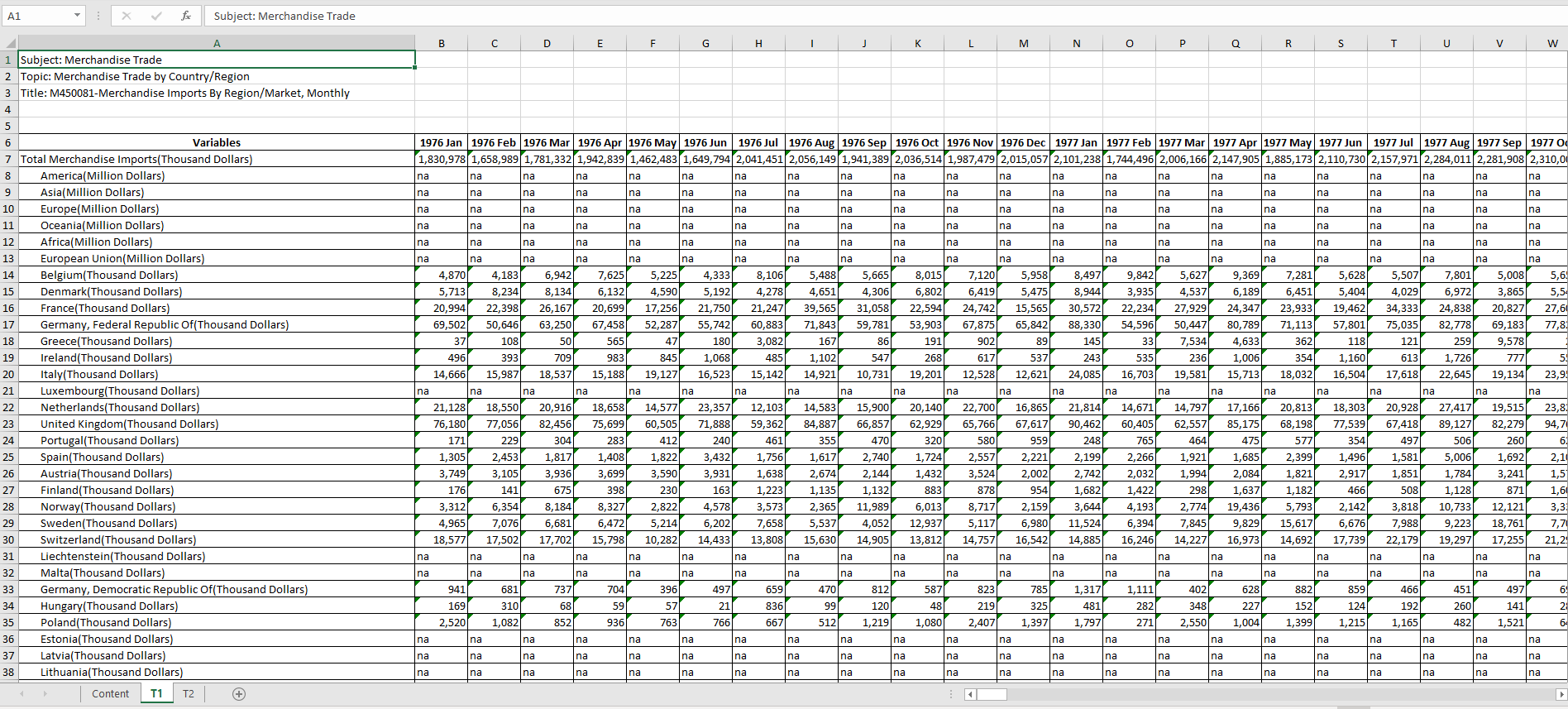 The data is available from Merchandise Trade by Region/Market and can be downloaded by clicking on the link ‘Download all in Excel’ on the same webpage. The file (outputFile.xlsx) consists of 3 sheets - Content, T1 which contains merchandise imports, and T2 which contains merchandise exports. The document includes merchandise trade information for more than one hundred countries and regions starting from Jan 1976 up to the present.