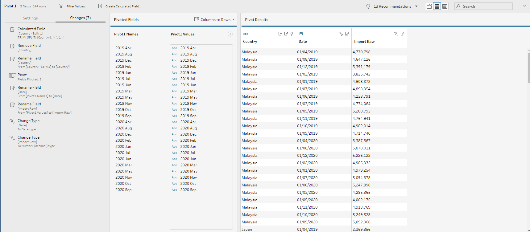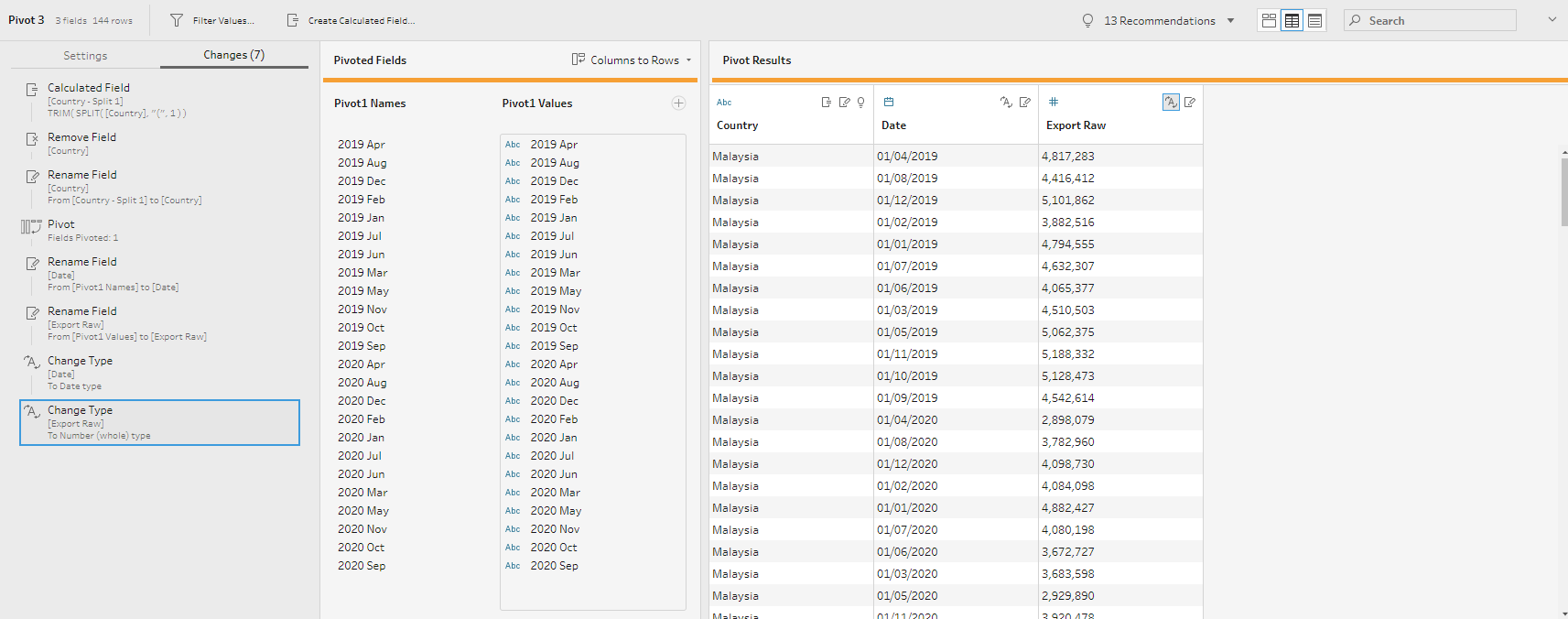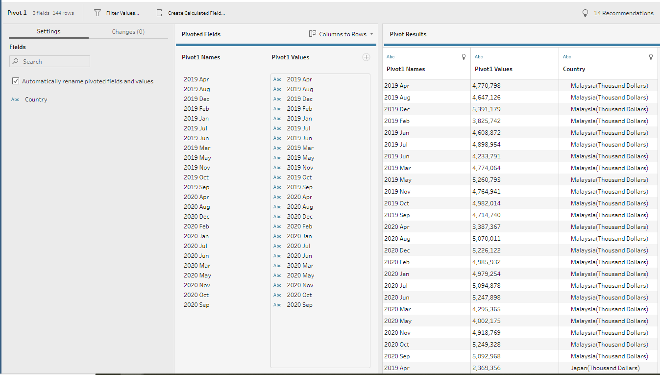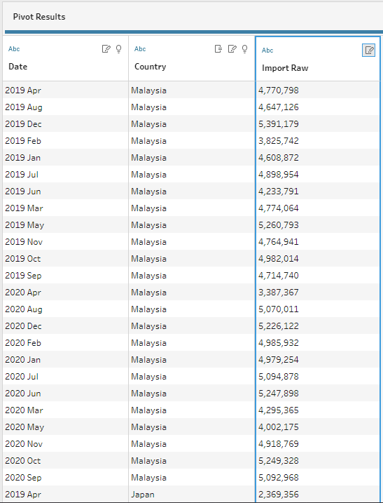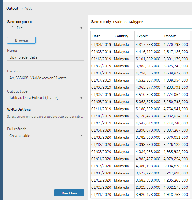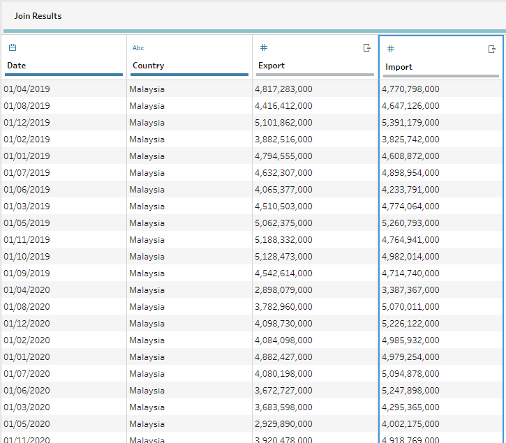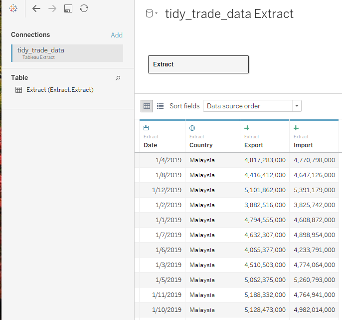 Through data preparation, the raw data has been transformed into a tidy format with only 4 data fields namely Date, Country, Export, and Import which can be easily visualised using Tableau Desktop.
