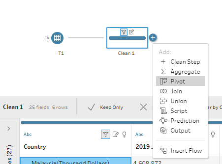 Click ‘Add a clean step’ hyperlink from the figure above. From the Clean 1, switch the display to ‘Show data grid’ to easily view the data.