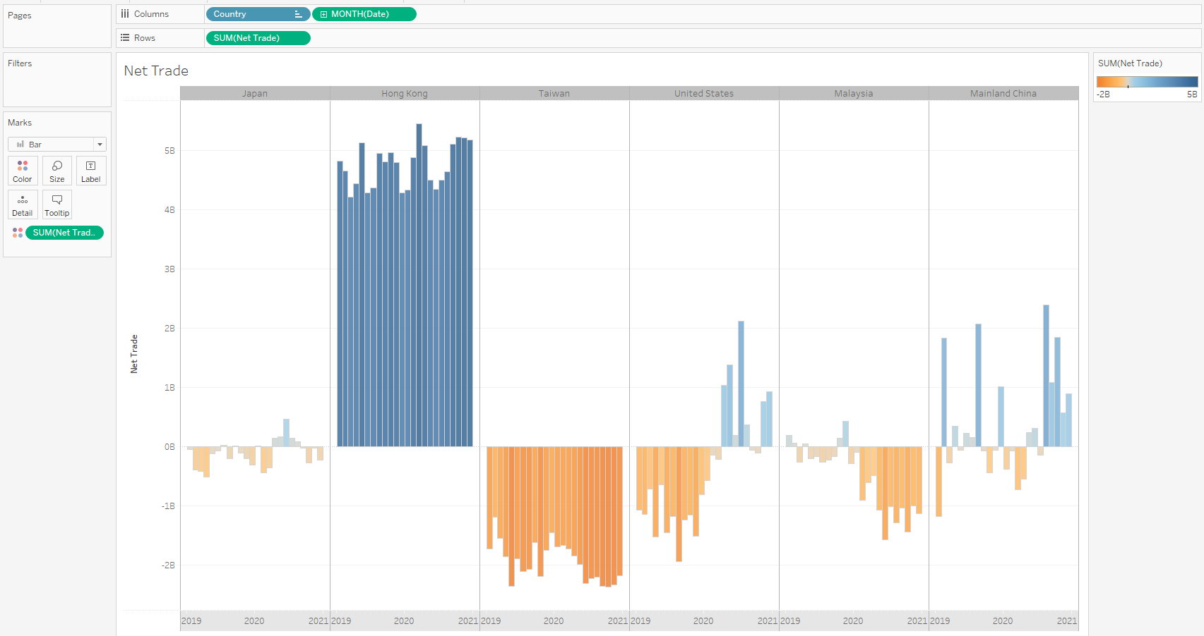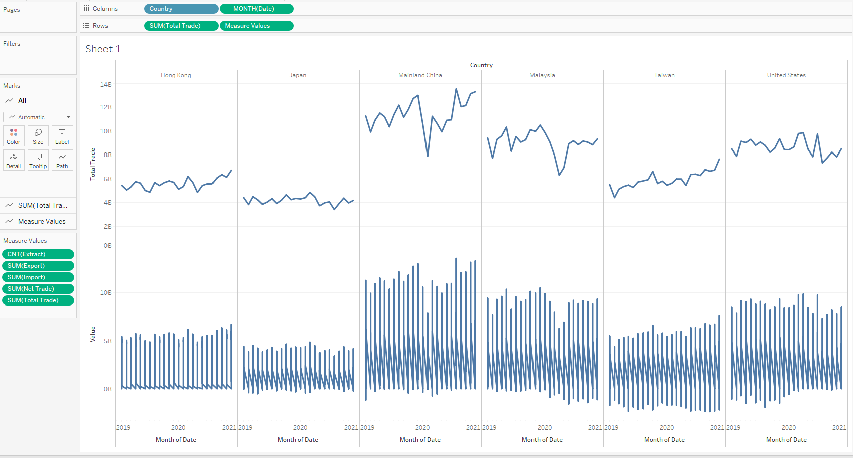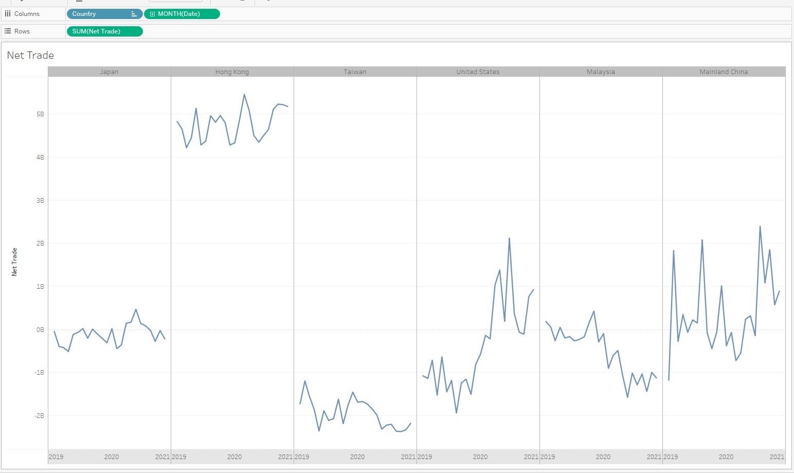 The same y-axis scale is used across different countries. All countries are placed on a single row instead of multiple rows, so it is easier to compare the trade values.