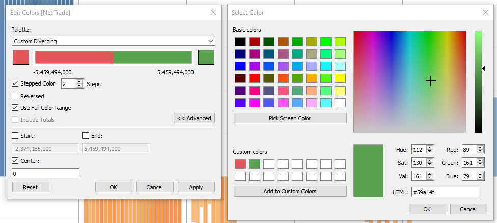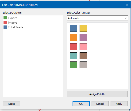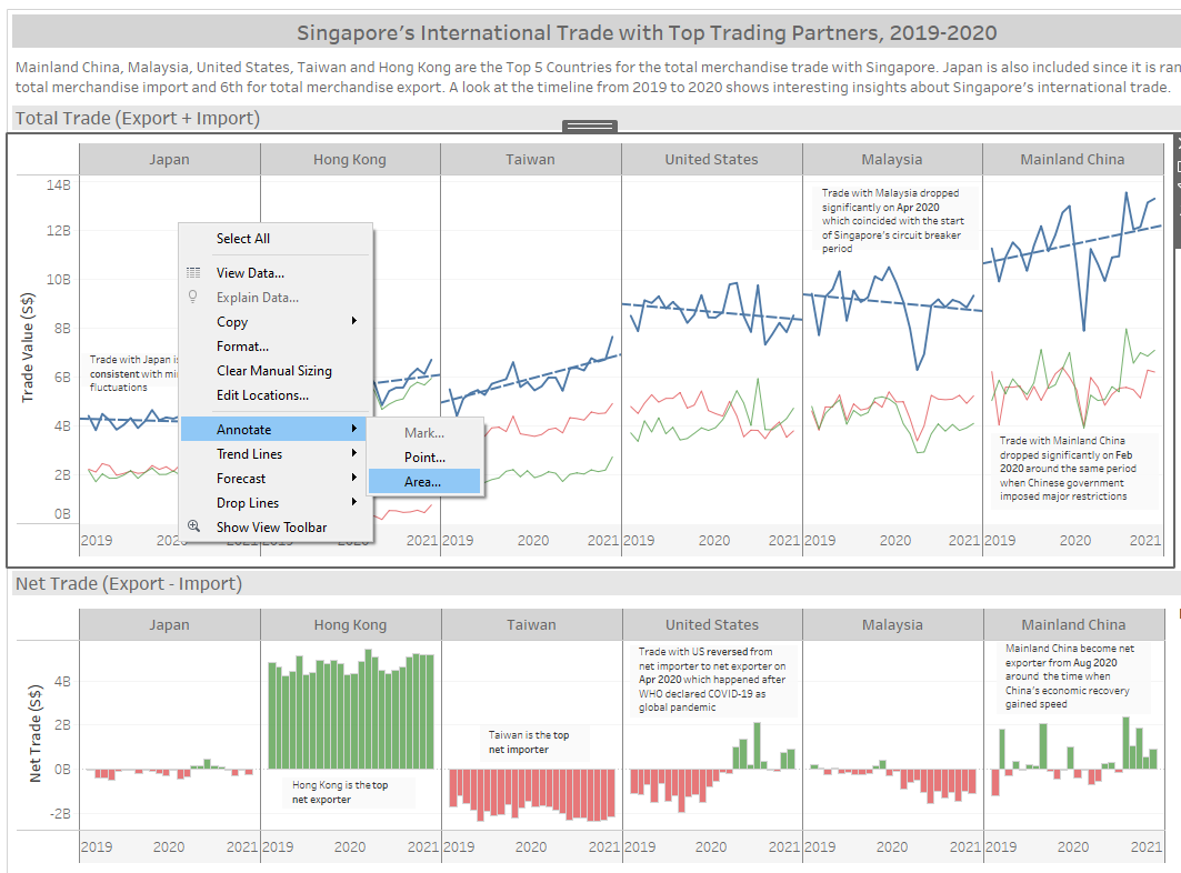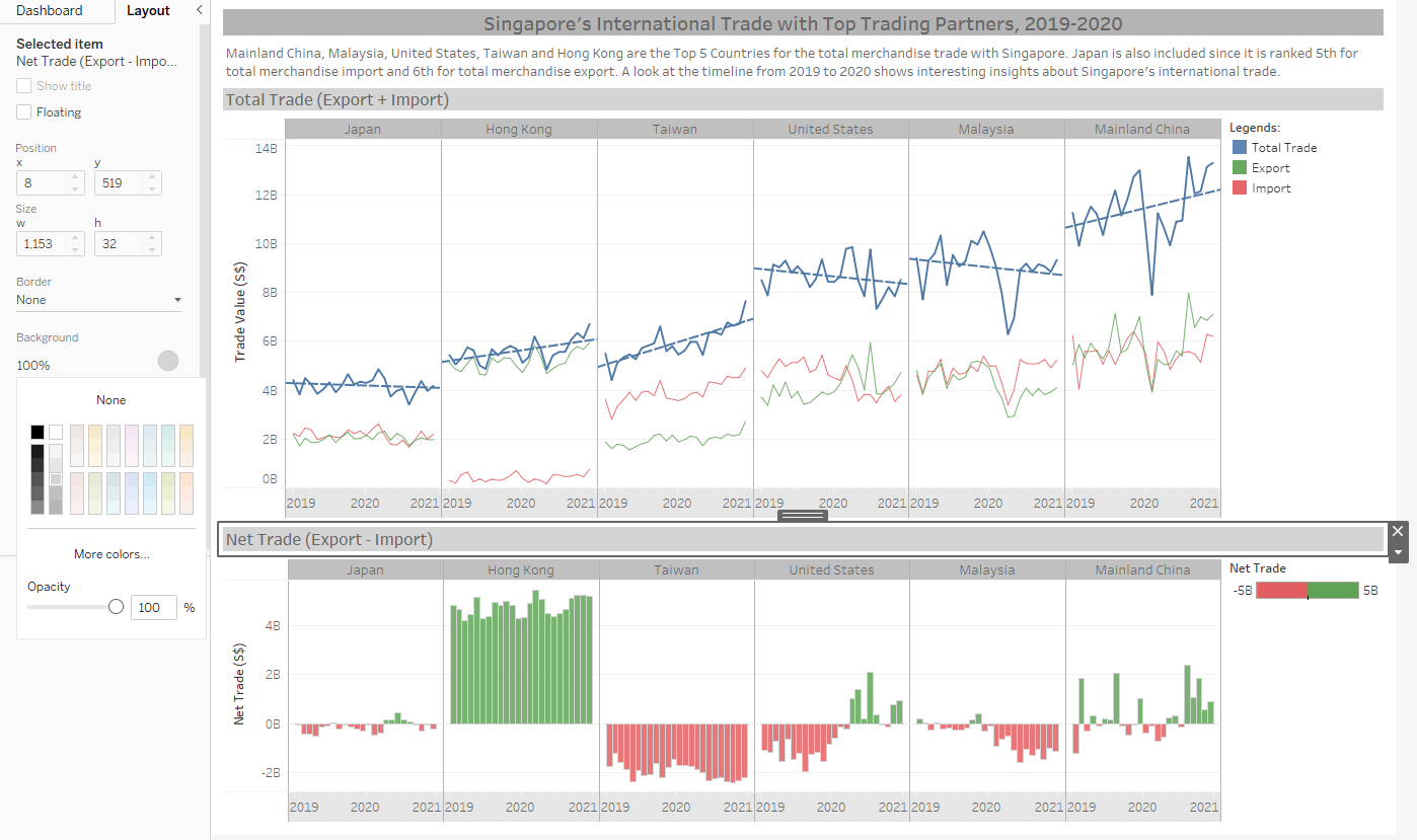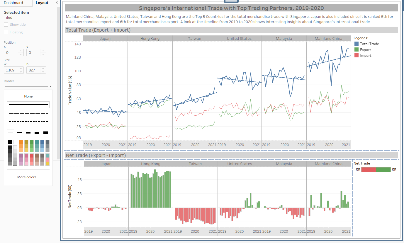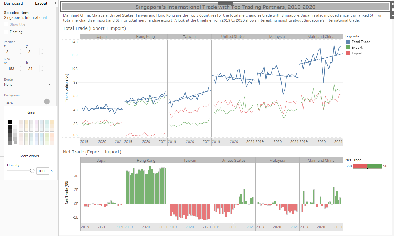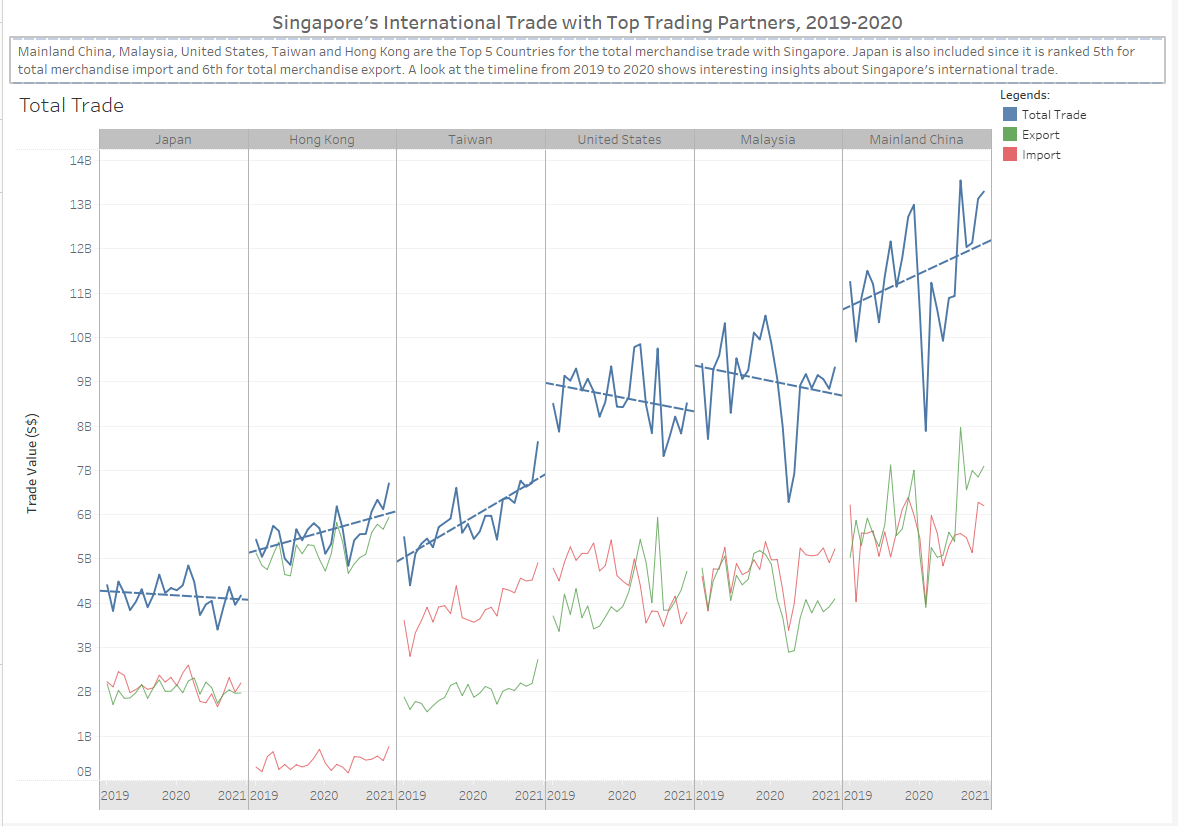 Line charts were used instead of area charts to easily illustrate the trade values. Green color is used for Export, red for Import and blue for Total Trade. This color scheme is chosen because it adheres to the practical guides of using color in charts and consistent with the graph from the media release of Enterprise Singapore.