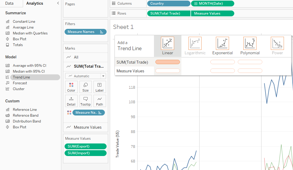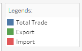 To apply the rules for encoding values in graph, line charts are used to display the time-series data. The line charts for Export and Import used the same scale to make it easier to interpret the data. Total Trade line chart is also added to show the total merchandise trade while Net Trade bar chart is included to show the difference of Export and Import.