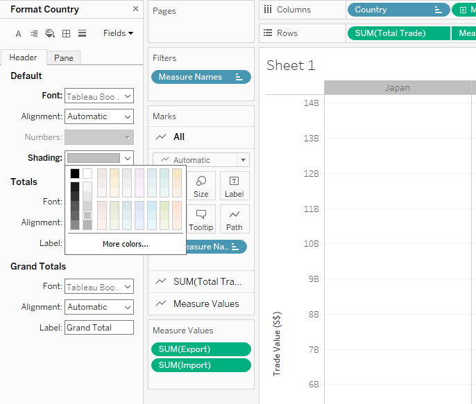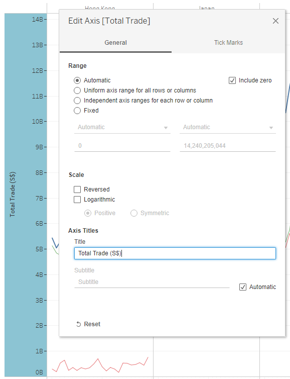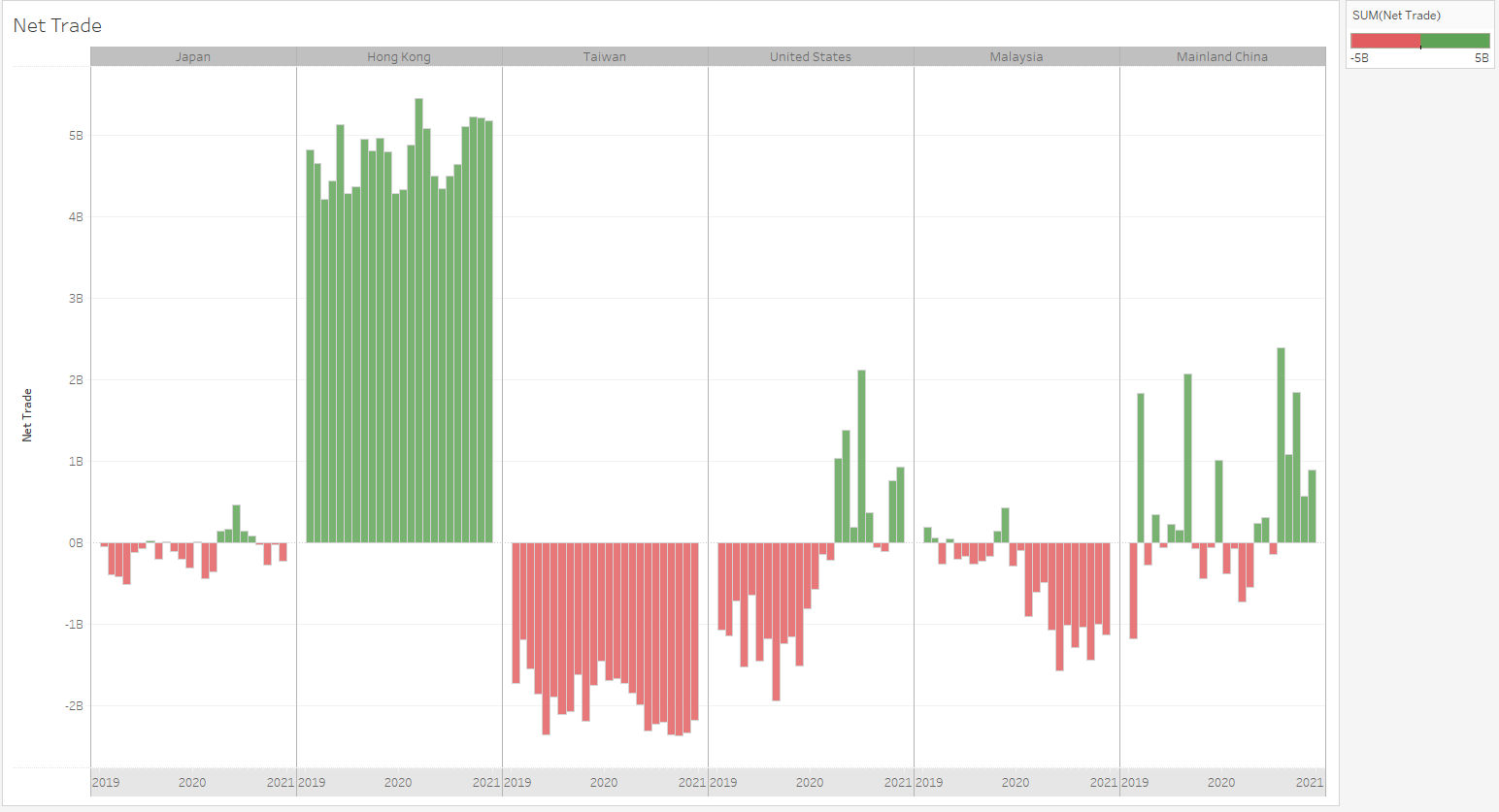 The different y-axis scale makes it difficult to compare the trade values across countries. Visually, it seems that Japan has higher trade values compared to others. However, Japan y-axis scales has a range of 0-2M which is significantly lower than Mainland China with range of 0-8M and US with range of 0-6M.