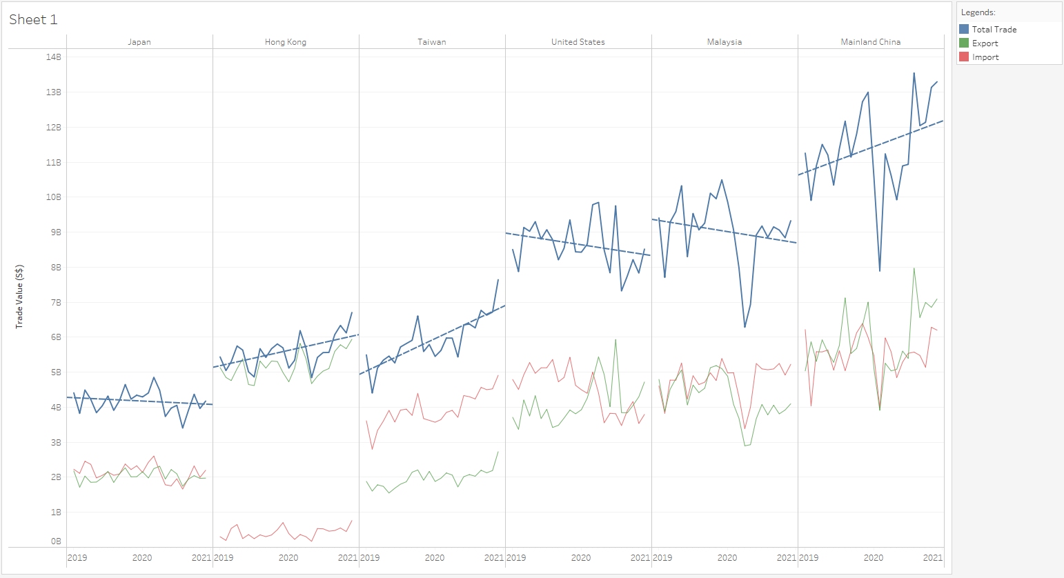 Based on the Total Trade linear trend, the trade with Japan is relatively consistent with minimal fluctuations. The total trades with United States and Malaysia are on downward trend. Nevertheless, the total trades with Hong Kong, Taiwan and Mainland China are on upward trend.