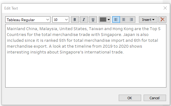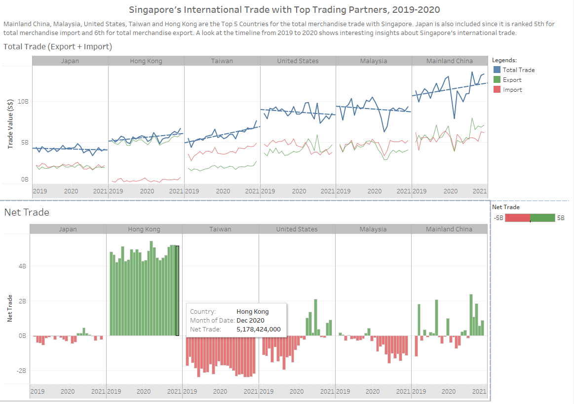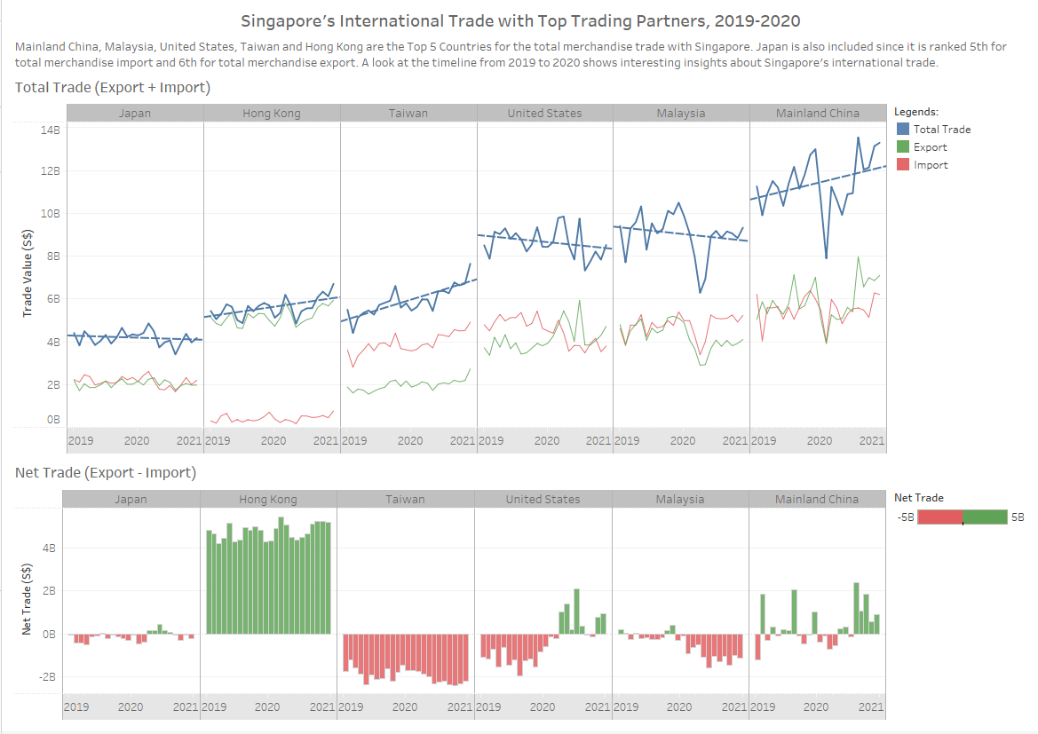 Based on the Net Trade bar chart, Hong Kong is the top net exporter while Taiwan is the top net importer. Additionally, the value of exports exceeds imports for Singapore’s merchandise trade with Mainland China. The value of imports exceeds exports for Singapore’s trade with Japan, United States, and Malaysia. These observations were also verified by SingStat infographics.