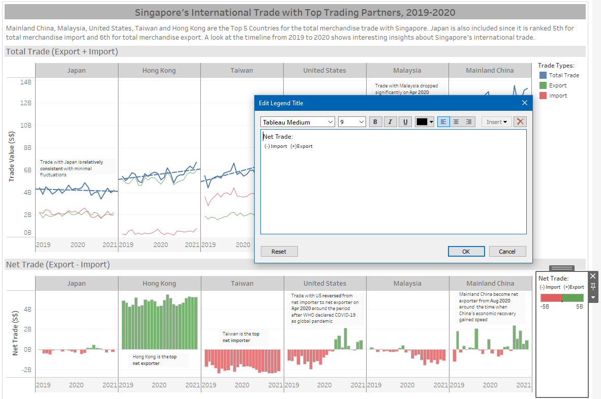 The legend title is updated to ‘Trade Types’. Text annotations are added to tell interesting data stories and insights.